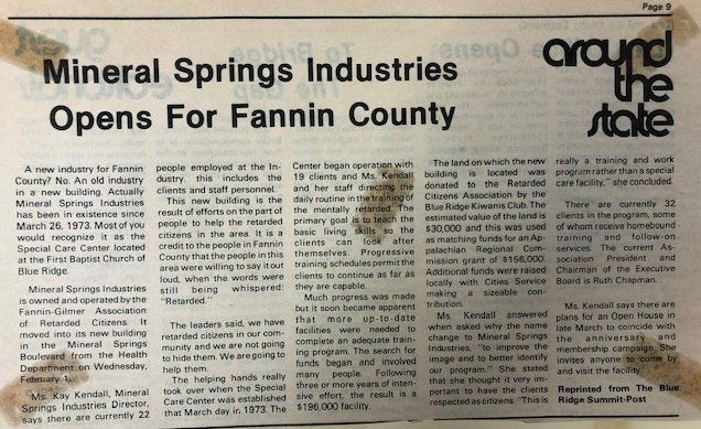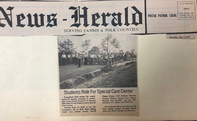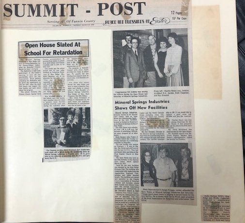On January 4, 1972 a group of concerned citizens met with County Commissioner, A.L. Stepp. This group included educators, ministers, social workers, and businessmen. On March 4, 1972 the Fannin County Association for Retarded Children was incorporated. The task of writing the grant application, finding a building to house the center, raising local match money, getting volunteers to prepare the building, and hiring staff began. The Fannin County Special Care Center opened on March 26, 1973. It was located in a house adjacent to the Blue Ridge First Baptist Church. There were 16 clients on the first day. Pre-school, school-age, and adults were all served.